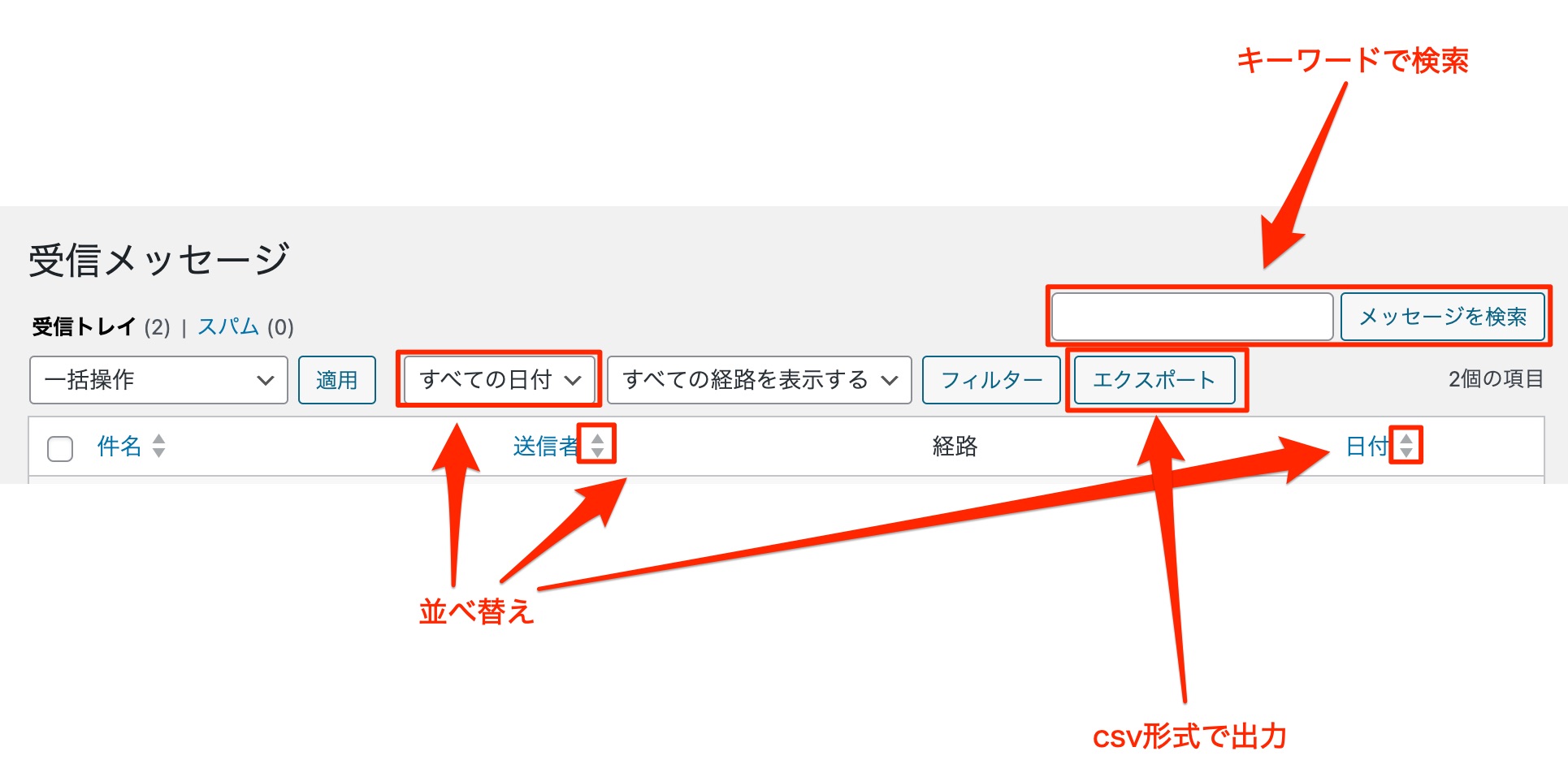 一覧表示では日付で並べ替えたり、キーワードから検索(絞り込み)することができます。