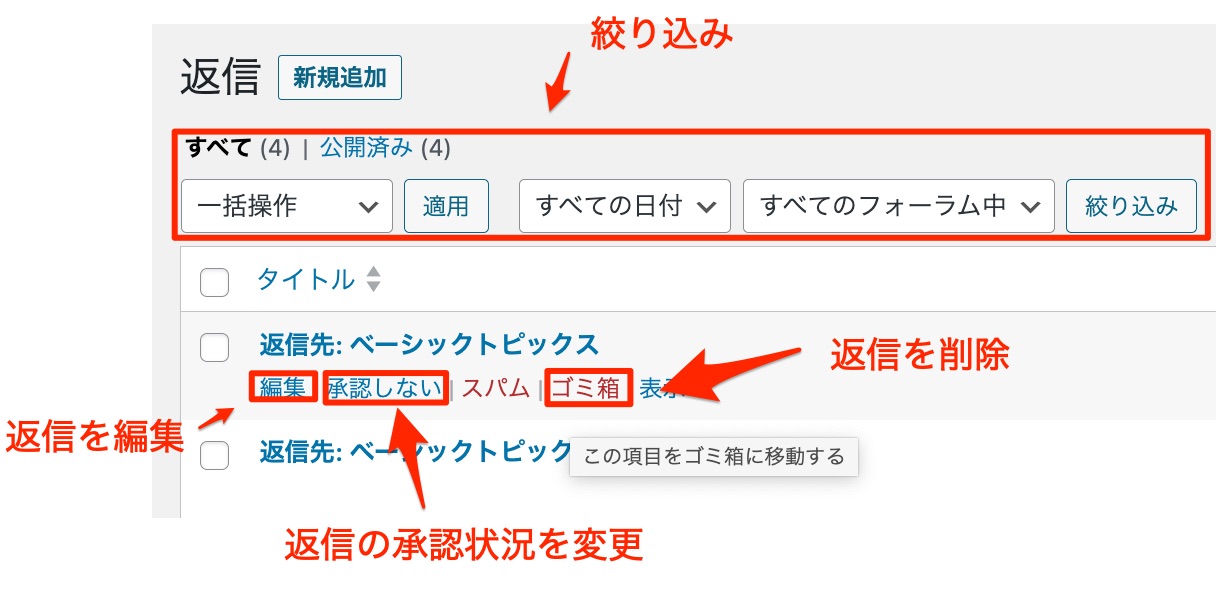 トピック一覧から削除したいトピックのタイトル下の【ゴミ箱ー移動】をクリックしてトピックを削除することができます。