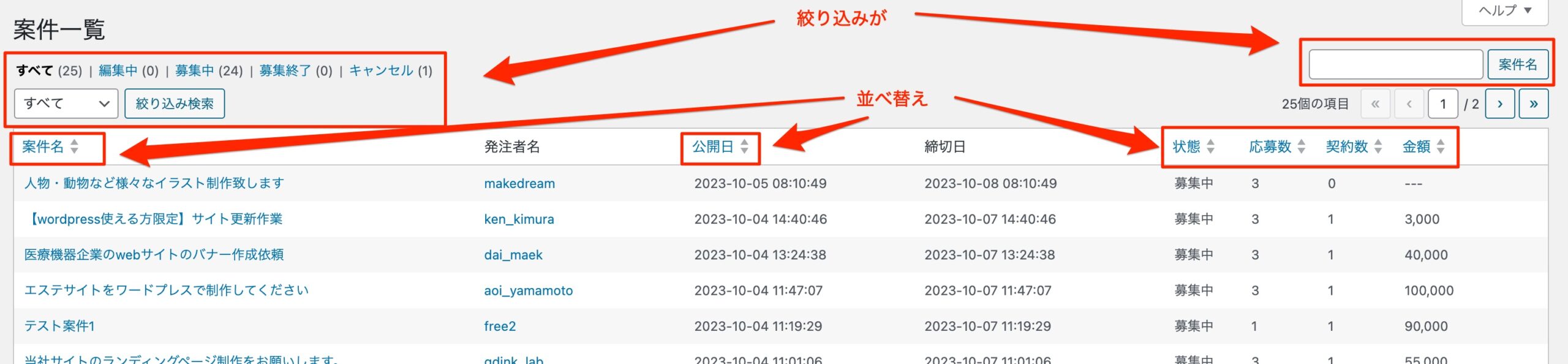 案件と取引状況の管理 マッチング機能管理では、会員がどのような案件を登録しているのか、応募状況はどのようになっているのか、会員ごとの利用(取引)の状況等を管理することができ、会員に対するサゼッションやセミナー等に役立てることができます。 案件一覧 案件管理 募集を公開している案件を一覧表示できます。一覧では、公開日や締切日の他、募集中や募集終了もキャンセル等の案件募集の状態、各案件への応募数、契約数等を一目することができます。また、キーワードでの検索や状態、契約数などで並べ替えて表示することや、募集中、募集終了等の状態で絞り込んで表示することもできます。各案件の案件名をクリックすると、その案件の詳細ページが開きます。 応募一覧 応募一覧 応募のあった案件の一覧を表示できます。また、キーワードでの検索や応募者名、コメント数などで並べ替えて表示することや応募中、契約成立等の状態で絞り込んで表示することもできます。各案件の案件名をクリックすると、応募のあった案件の詳細ページが開き、案件の内容と、応募の内容を見ることができます。 契約一覧 契約一覧 契約に至った案件の一覧を表示できます。また、また、キーワードでの検索や、契約日、受注者、発注者で並べ替えて表示することや作業中、検収中等の状態で絞り込んで表示することもできます。 通知一覧 通知一覧 「 応募がありました」「選定されました」等のシステムから会員に送られた通知の一覧を表示できます。募集を公開している案件を一覧表示できます。一覧では、対象者や通知の内容を一目することができます。また、キーワードでの検索や期間で絞り込んで表示することもできます。各案件の案件名をクリックすると、その案件の詳細ページが開きます。 取引分析 取引分析 取引分析では、登録済みの各会員がどのように(どの程度)システムを活用しているかを確認することができます。確認することができるデータは、入会日、最終ログイン、案件数、発注数、応募数、受注数、評価です。また、それぞれのデータで並べ替えて表示したり、会員名で検索することができます。 取引履歴 取引履歴 取引履歴では、募集、応募、契約、決済といった取引の対象や更新された日時で絞り込んで表示することができます。
